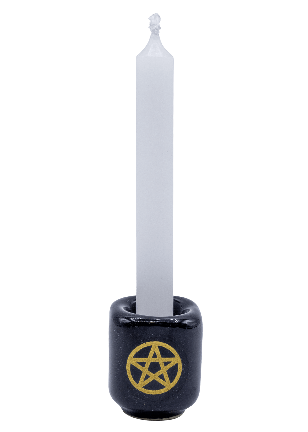Ground your ritual practice with the timeless power of the pentagram using this Ceramic Pentagram Chime Candle Holder. Crafted from glossy black ceramic and adorned with a gold pentagram symbol, this holder is both protective and symbolic, representing balance, spiritual connection, and the five elements (earth, air, fire, water, and spirit).