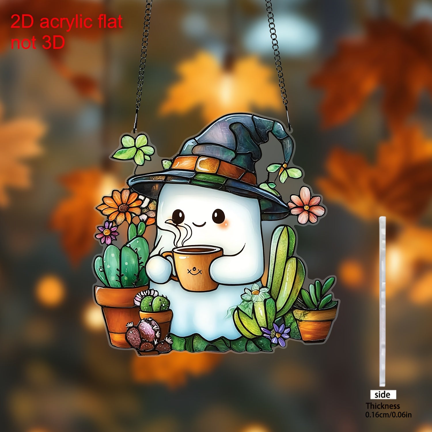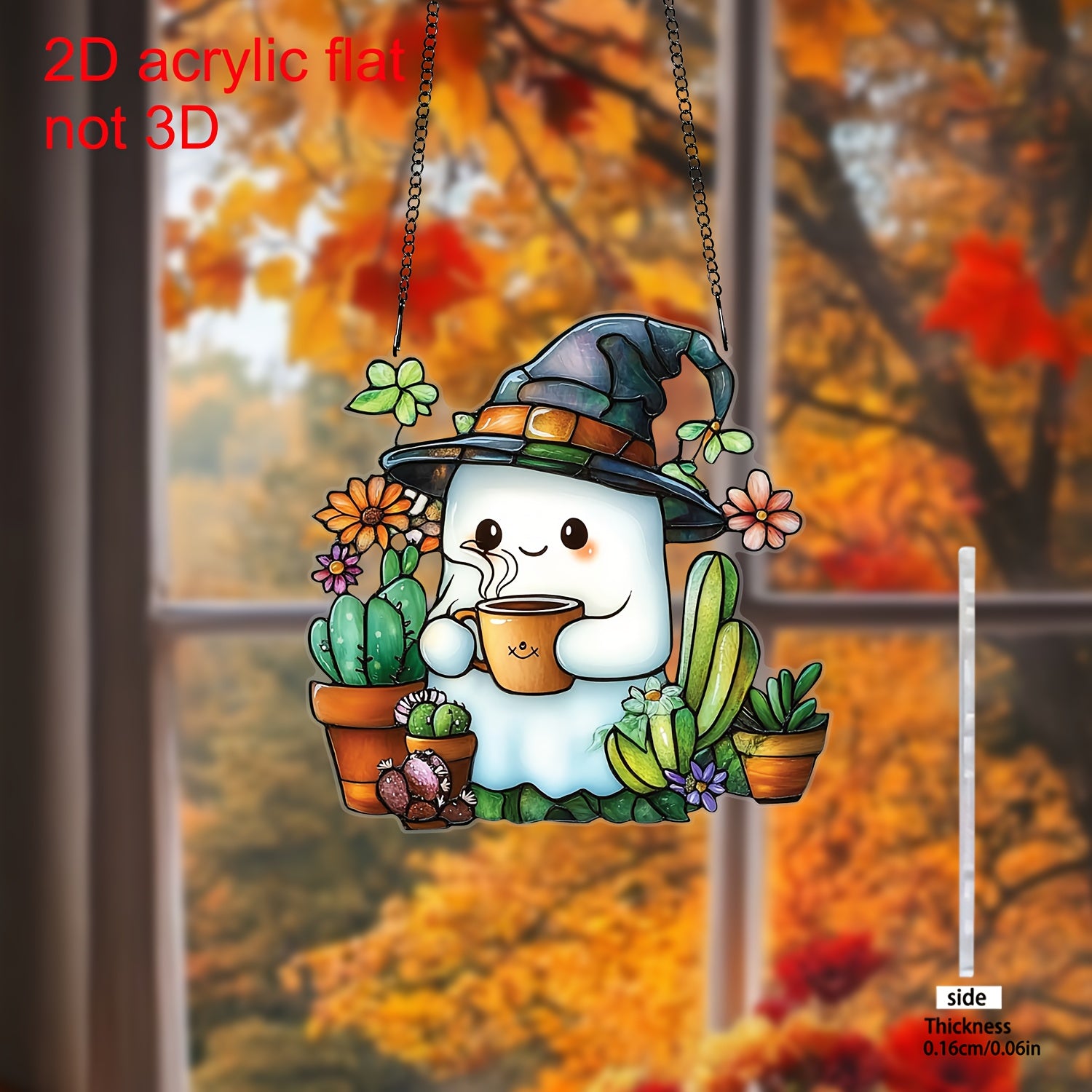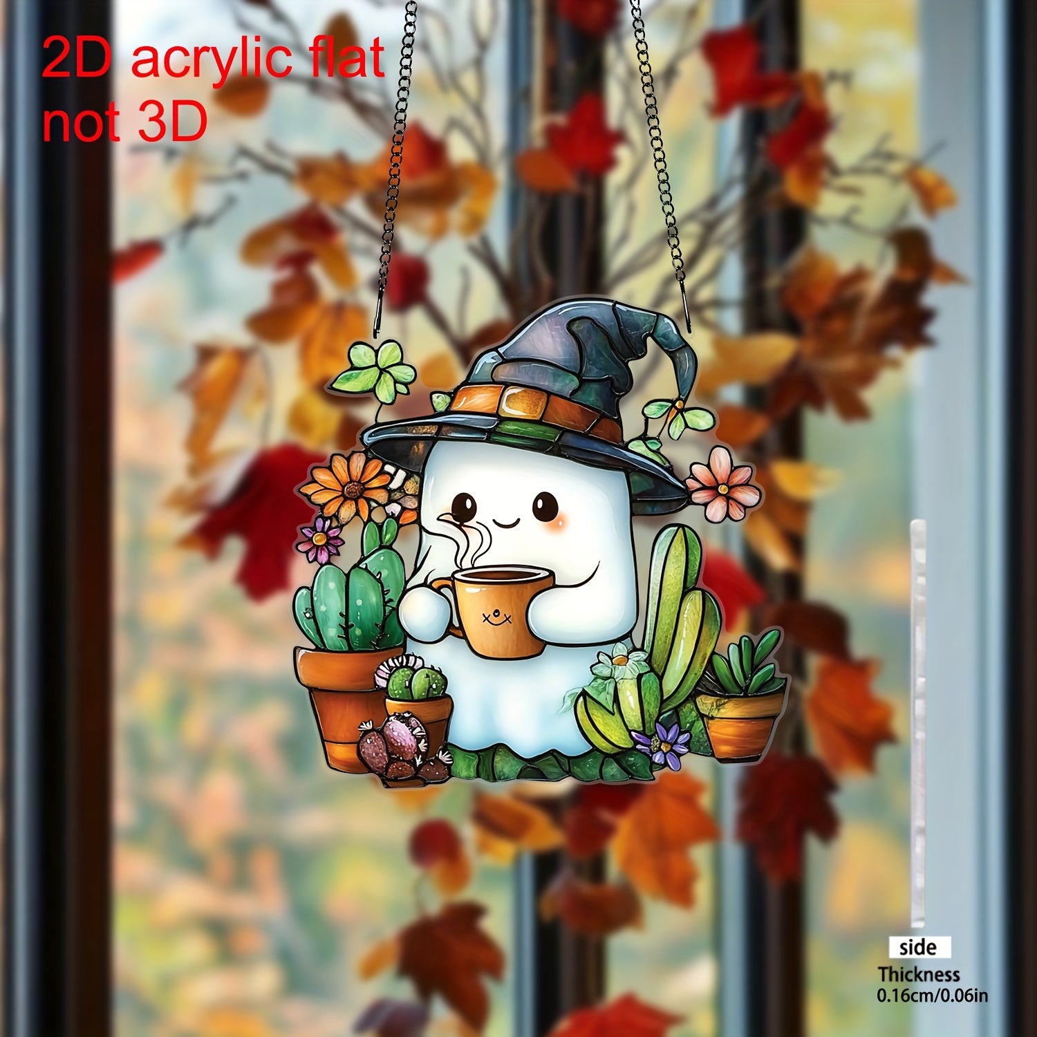 Halloween Window Suncatcher - Cute in Witch Hat with Coffee & Succulents, 2D Flat Hanging Decor for Home, Durable Plastic, No Electricity Needed, Perfect for Halloween, Christmas, Birthday & Party Gifts.