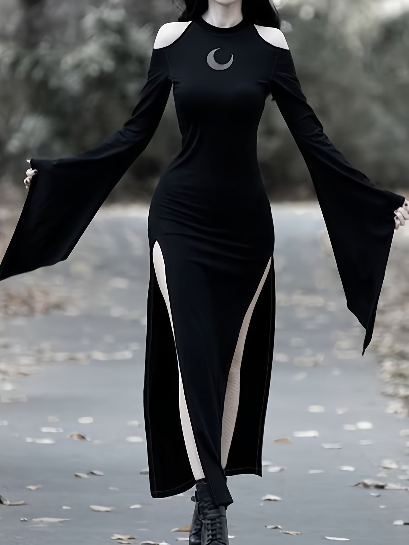 Women's Gothic Elegant Maxi Dress with Bell Sleeves & Gothic Collar - Long Sleeve A-Line Floor-Length Party Dress with Slit Hem, Machine Washable All-Season Formal Evening Gown for Women (Halloween, Themed Events, Casual Attire) - Dark