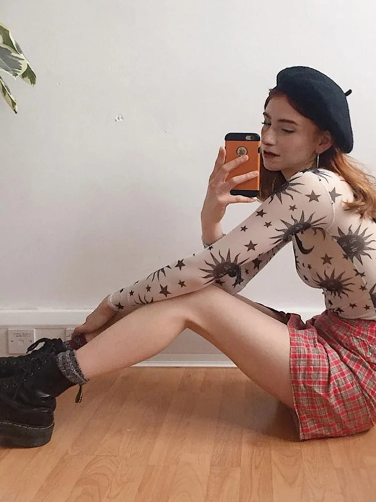 Sun Moon Printed Transparent Mesh Sexy T-Shirt Women O-Neck Long Sleeve Slim Basic Casual Female Tops Spring Fall